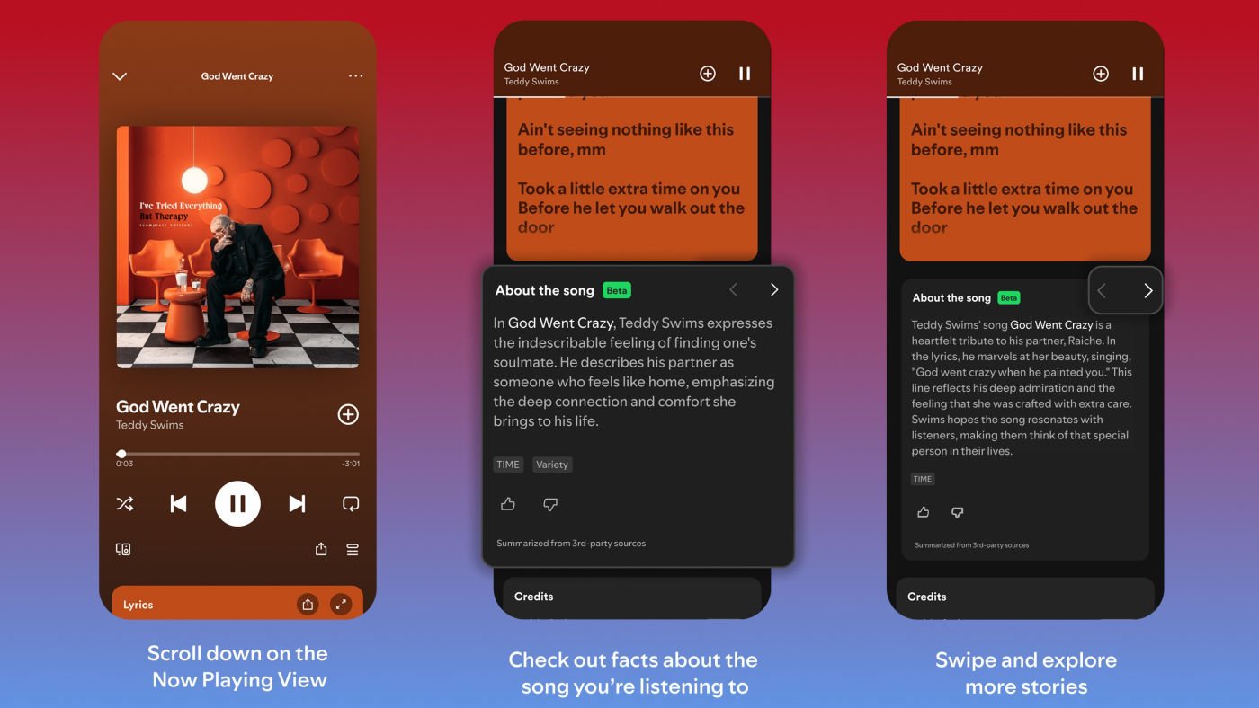 « Les fans de musique connaissent ce sentiment : une chanson vous arrête net et vous voulez immédiatement en savoir plus », expliquer Spotify. « Qu’est-ce qui l’a inspiré et quelle est sa signification profonde ? » Nous pensons que comprendre le processus créatif et le contexte d’une chanson peut approfondir votre lien avec la musique que vous aimez ».